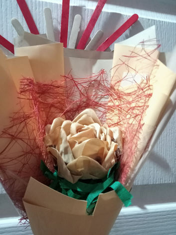 Wrap the rose with decorative netting and attach leaves or stems for a polished look. Use ribbons or tape to finish and secure the design.
