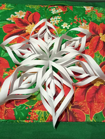 A layered paper decoration shaped like a snowflake, made by folding, cutting, and assembling multiple pieces.